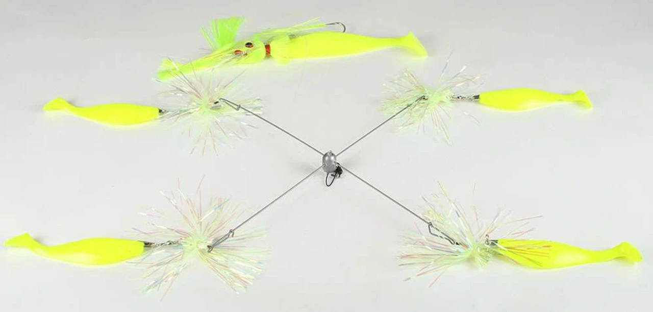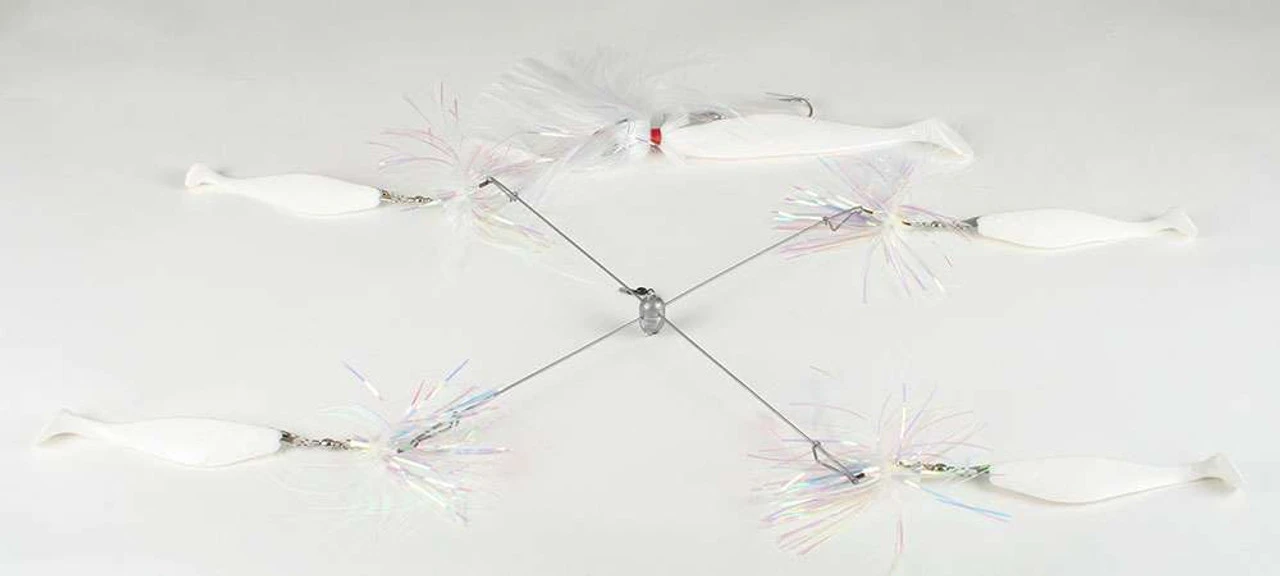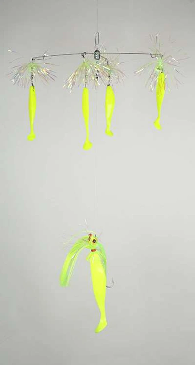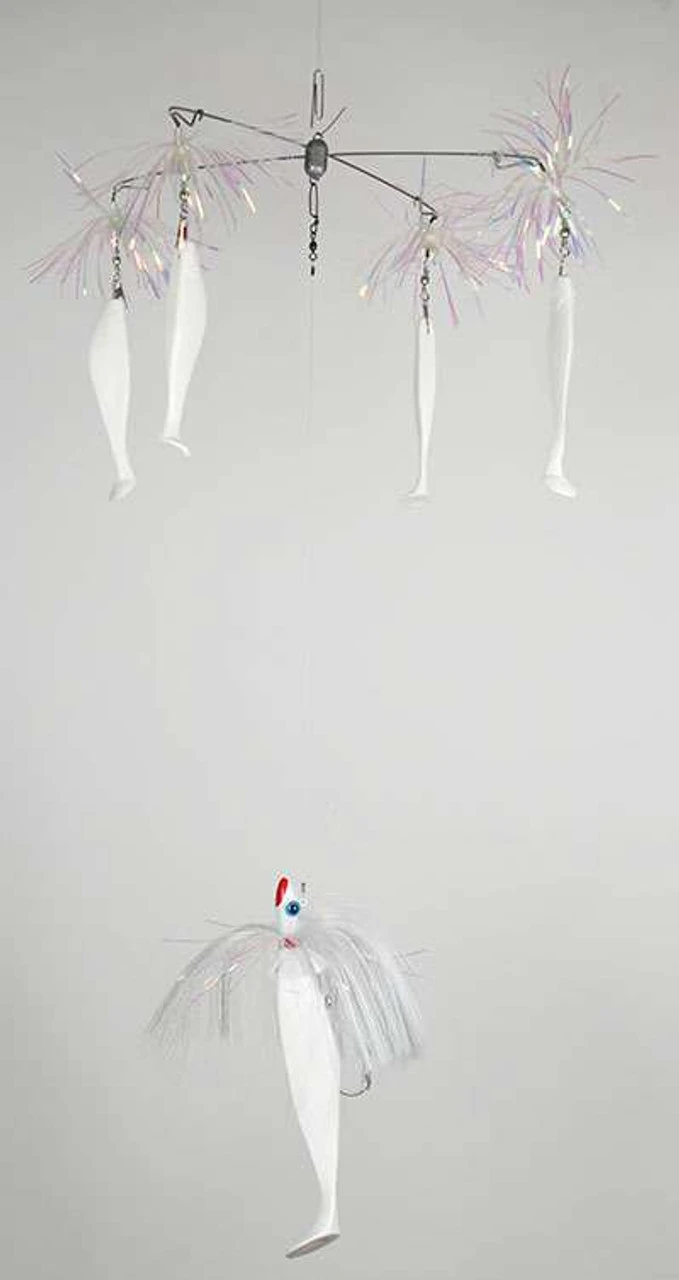 The Blue Water Candy is a 15in weighted umbrella with 4 skirted 6? shad with feather weight teasers and a 9″ shad chaser with 4oz. parachute trailing behind. Designed for saltwater fishing.