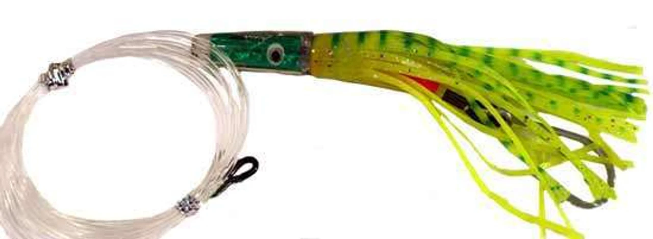 The Sportfish Products 9 inch Tuna mamba is a perfect trolling lure for Tuna, Albacore, Wahoo, Mahi. The weighted head will give you just enough action to make the difference. Rigged with an 8/0 hook and 200lb mono leader.