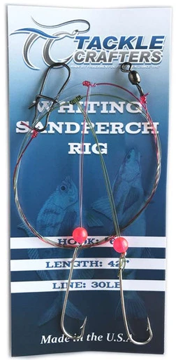 The Tackle Crafters Whiting Sandperch Rig features quad color mono leader and two #6 long shank hooks. Made in Jupiter Florida.